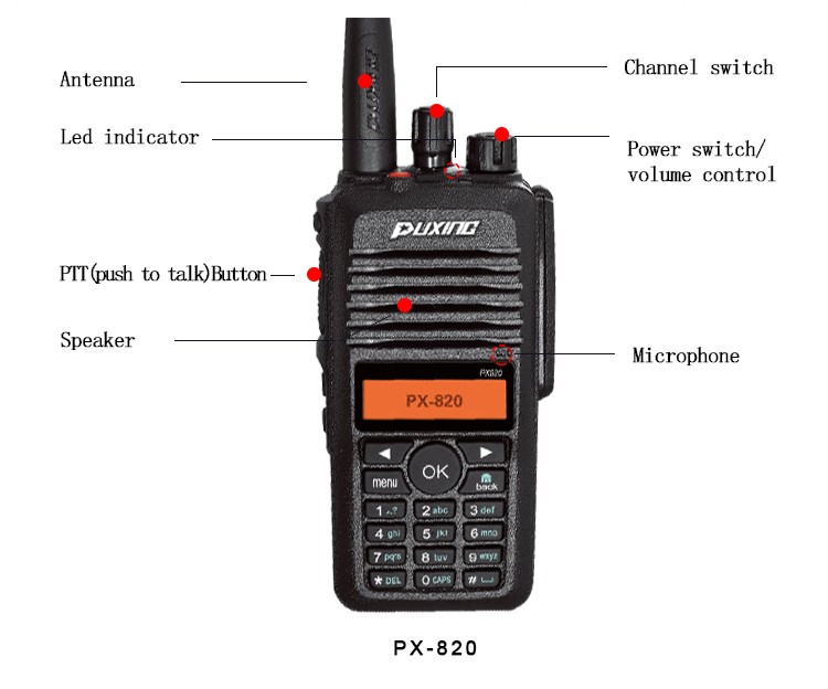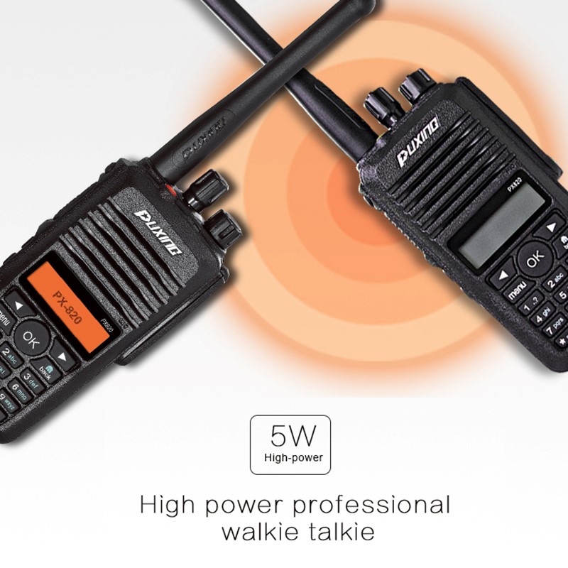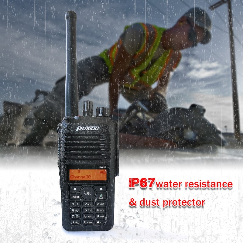 PX-820 adds screen and keyboard on the basis of PX-800, has more functions. The radio has IP67 professional IP67 dustproof and waterproof grade, superior protective performance ensures communication even in harsh climates or complex environments, The radio covers two communication modes: digital and analog, to achieve transition from digital to analog. The basic voice encryption function protects users' calls. PX-820 provids standard signaling call modes: individual call, group call, all call, and emergency call.